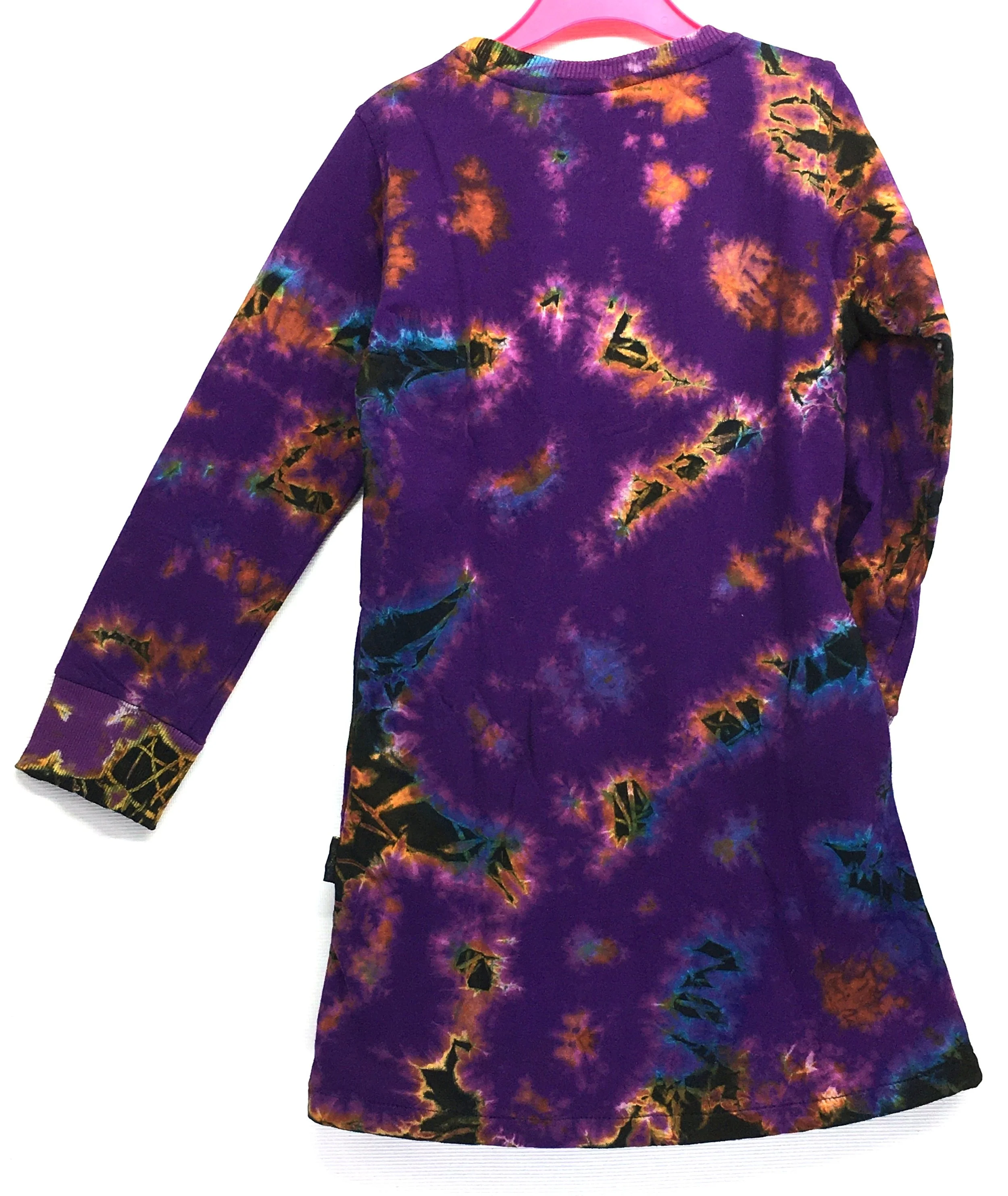 Swirls of purple, black and orange create a vibrant scrunch tie-dye pattern.